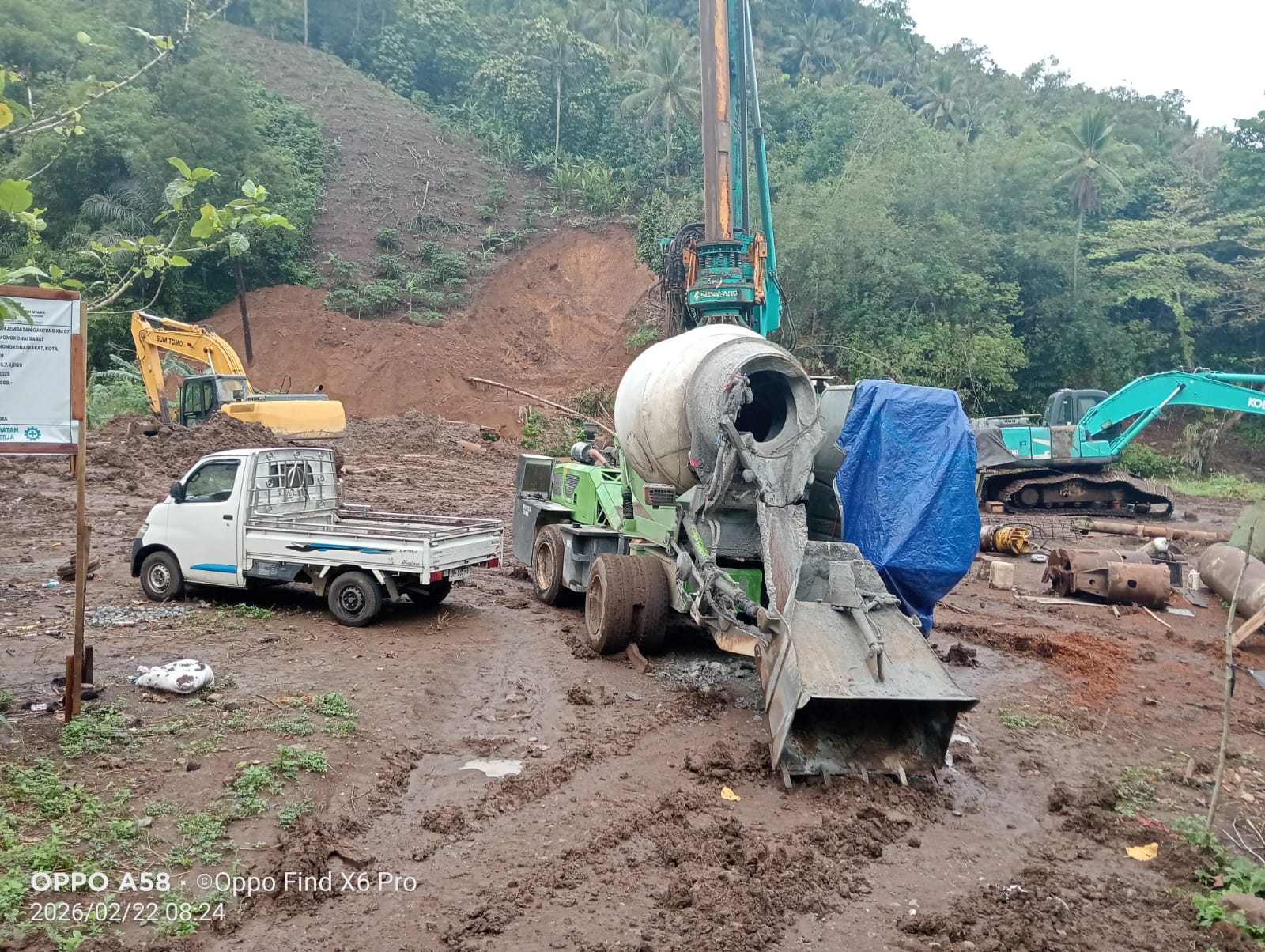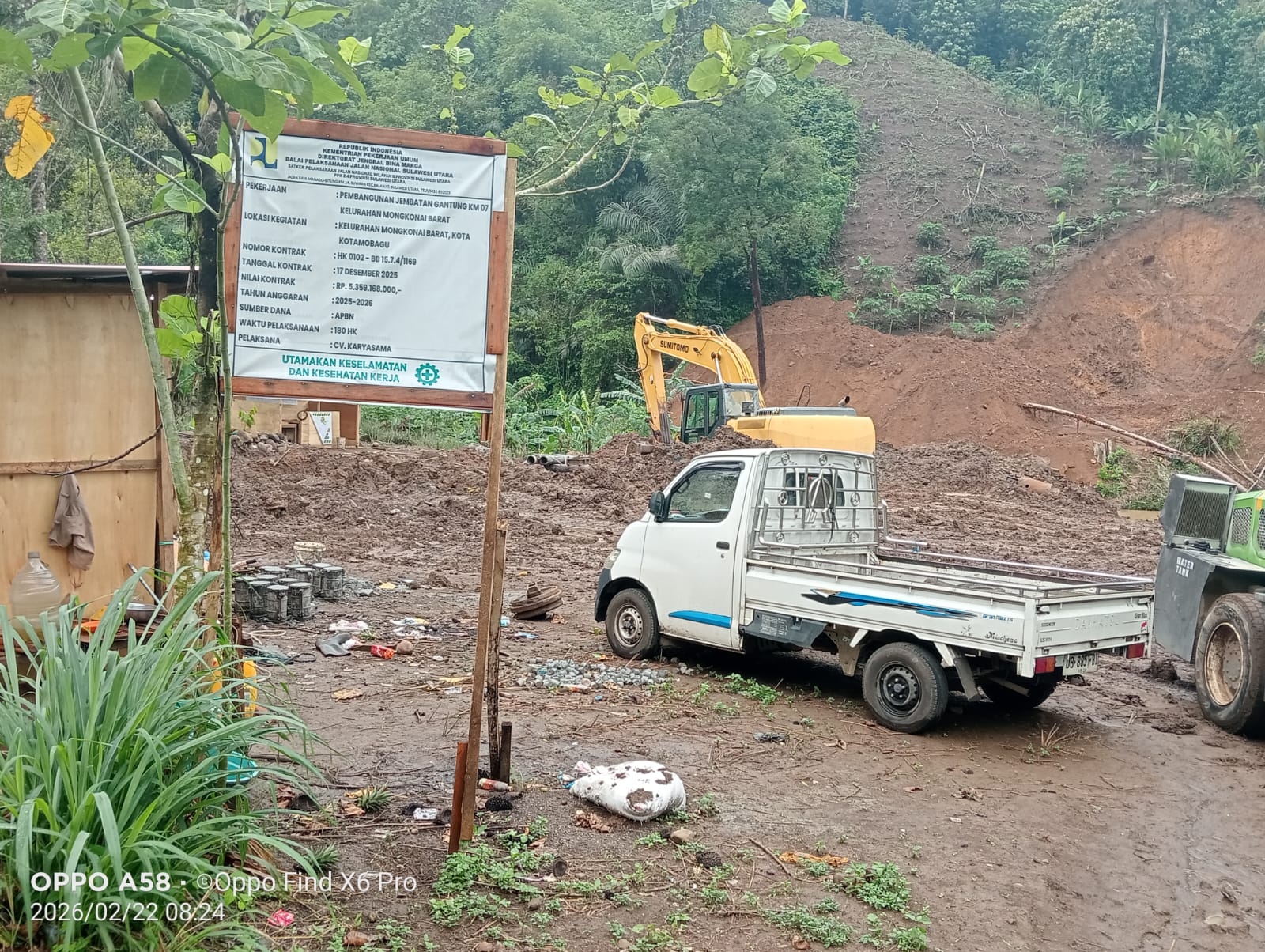 Nampak diarea lokasi proyek, terpampang baliho berukuran besar yang menampilkan narasi seolah-olah proyek jembatan merupakan hasil perjuangan seorang tokoh politik dengan dukungan masyarakat.